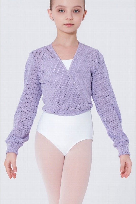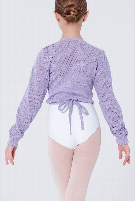 GUIMAUVE is an elegant wrap-over top from the BONBON Collection. Its V-neckline and adjustable design with drawstring accentuate the silhouette with grace. Embellished with an openwork pattern and a subtle touch of lurex, GUIMAUVE brings softness and tenderness to warm-ups. It layers perfectly over a leotard and tights, or harmonizes seamlessly with the other pieces from the BONBON Collection.